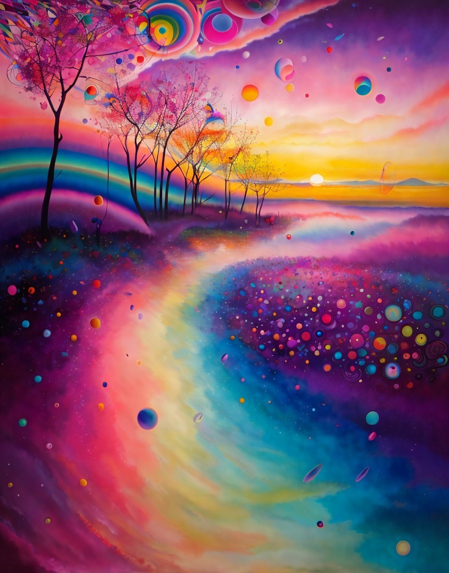 Colorful surreal landscape with rainbow path, whimsical trees, floating orbs, and starry sky.