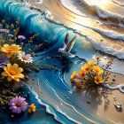 A vibrant scene of a serene beach. Gentle waves lap at the shore, while colorful flowers bloom, adding a touch of nature. A seagull gracefully soars above, completing the picturesque view.