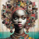 A striking portrait of a woman with vibrant makeup and artistic hair rollers, set against a colorful, splattered background. Her bold expression and unique style capture attention.