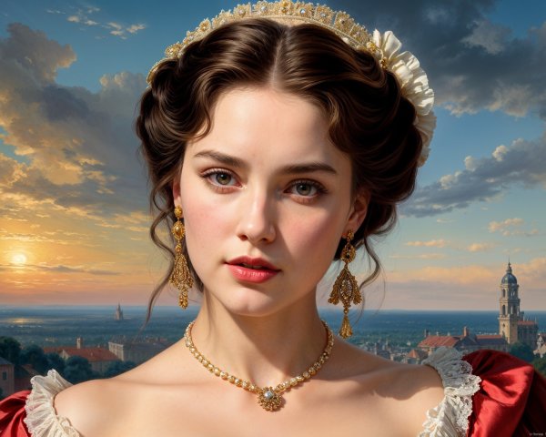 A stunning woman in a luxurious teal dress, adorned with intricate pearl jewelry. Her elegant hairstyle features a white flower, set against a rich, ornate backdrop that enhances her beauty.