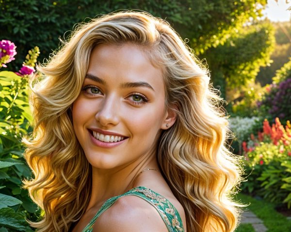 A close-up portrait of a woman with blonde hair and striking green eyes. She has a natural expression, with soft lighting highlighting her features against a dark background.