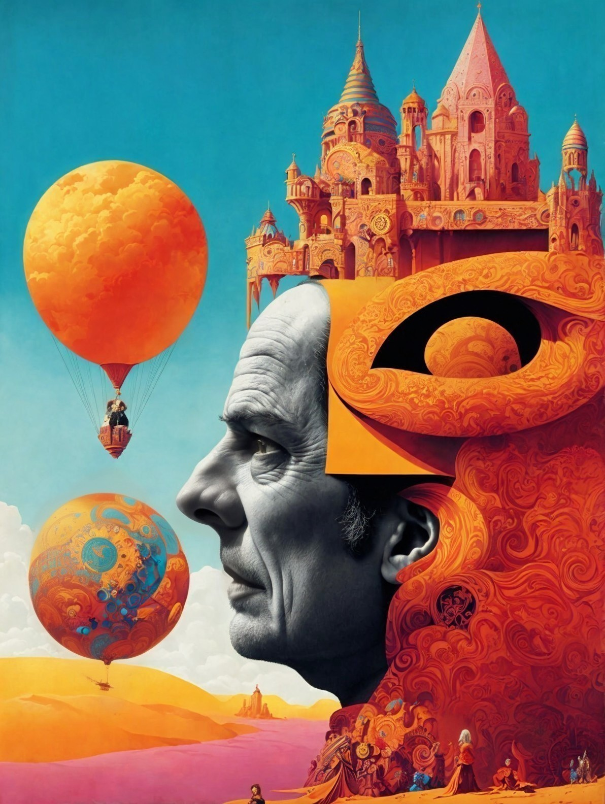 A vibrant surrealist artwork blending a profile portrait with fantastical landscapes, swirling patterns, hot air balloons, and whimsical castles in the sky.
