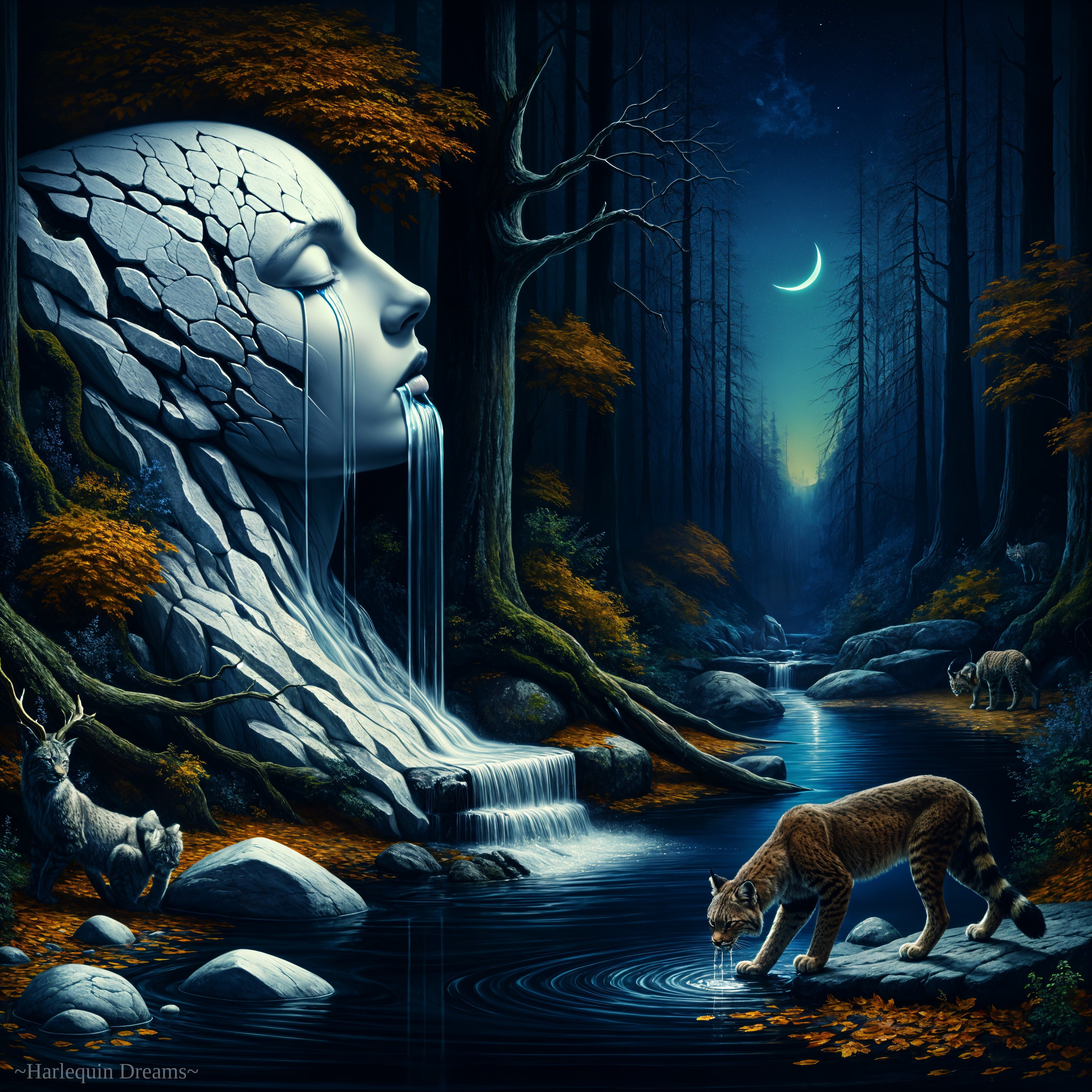 A mystical forest scene featuring a giant, cracked stone face weeping into a serene stream. Nearby, a tiger drinks water, surrounded by autumn foliage and soft moonlight.