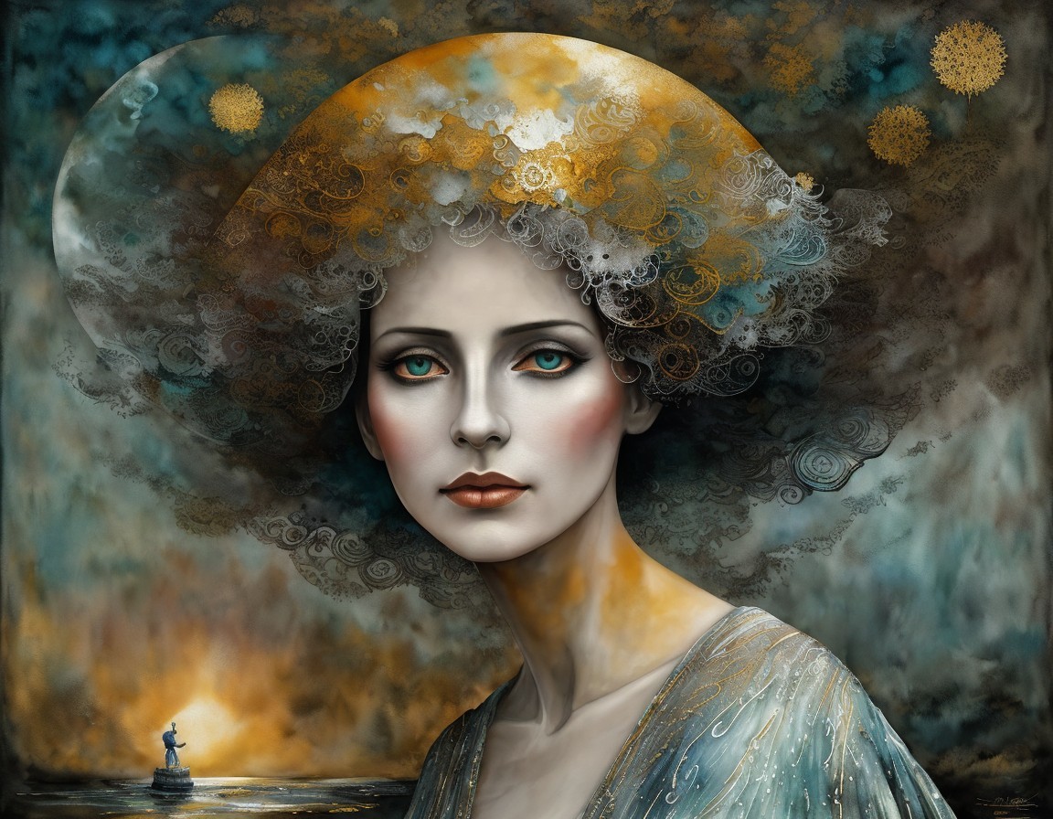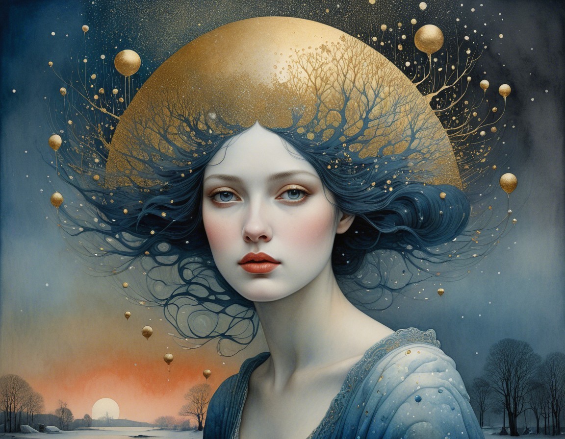 Catrin Welz-Stein, Zdzisław Beksiński, Jacek Yerka and Yossi Kotler style mix, surreal winter landscape, watercolour and ink illustration, wet-on-wet, loose water effects, white, salmon, indigo and golden paint splatter, voronoi pattern, richly textured, ice queen with frozen Queen Anne's lace and grasses, river, clouds, by Susanne, beautiful vibrant colors, opalescent gradient.