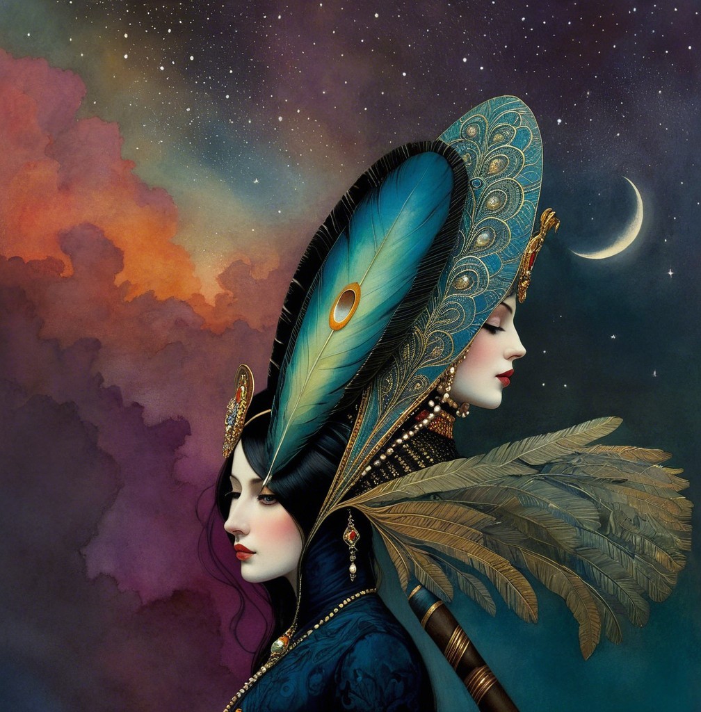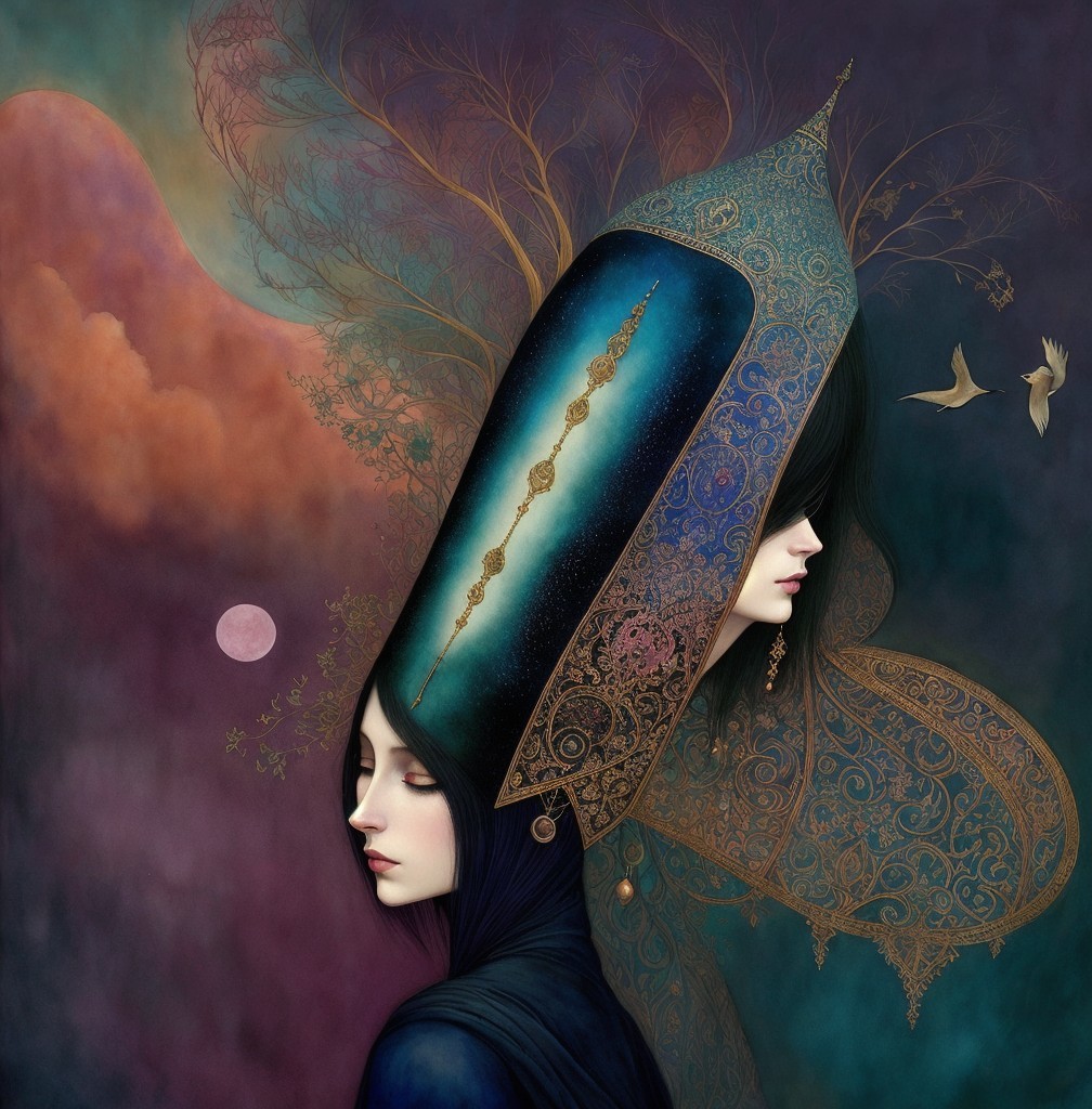 A mysterious woman in a lavish turquoise gown adorned with intricate jewelry gazes thoughtfully. Behind her, two horsemen silhouette against a vibrant sunset and starry sky in a fantasy landscape.
