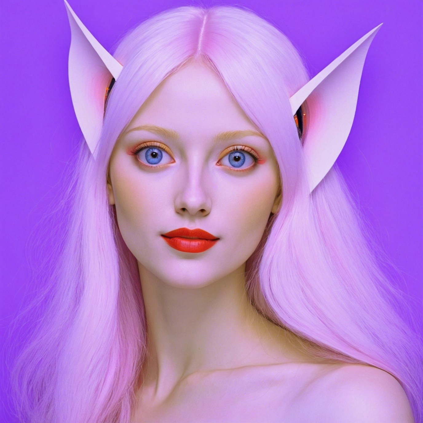 A model with long, pastel pink hair and striking blue eyes poses against a purple background. She has oversized, stylized ear accessories and bold red lips, creating a whimsical, ethereal look.