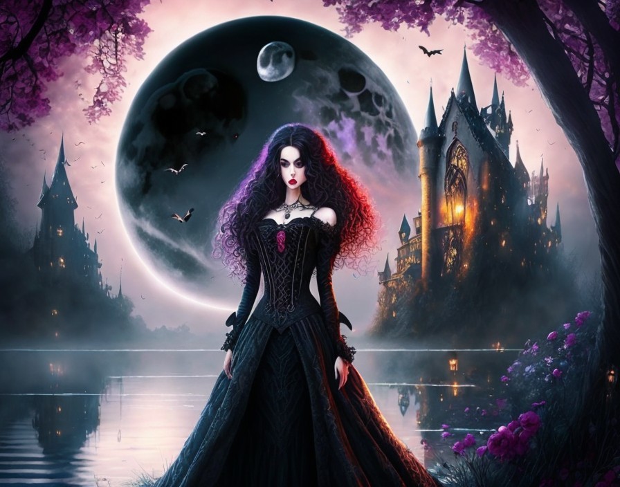 A gothic woman stands before a castle and large moon amidst a mystical purple-toned landscape with bats and lanterns.
