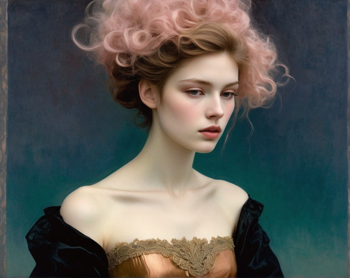A portrait of a woman with pink hair and vintage attire on a teal background with gold accents.