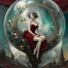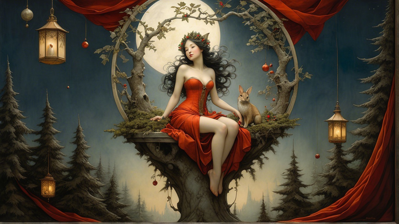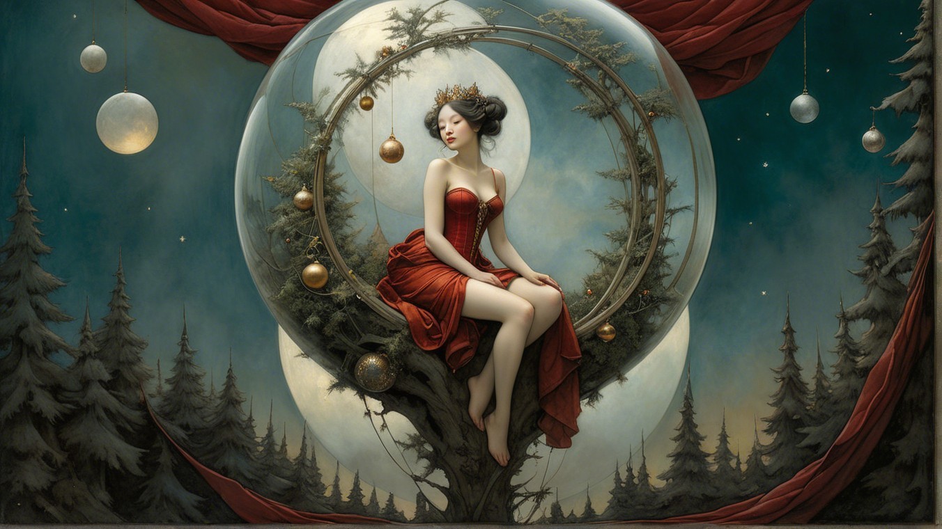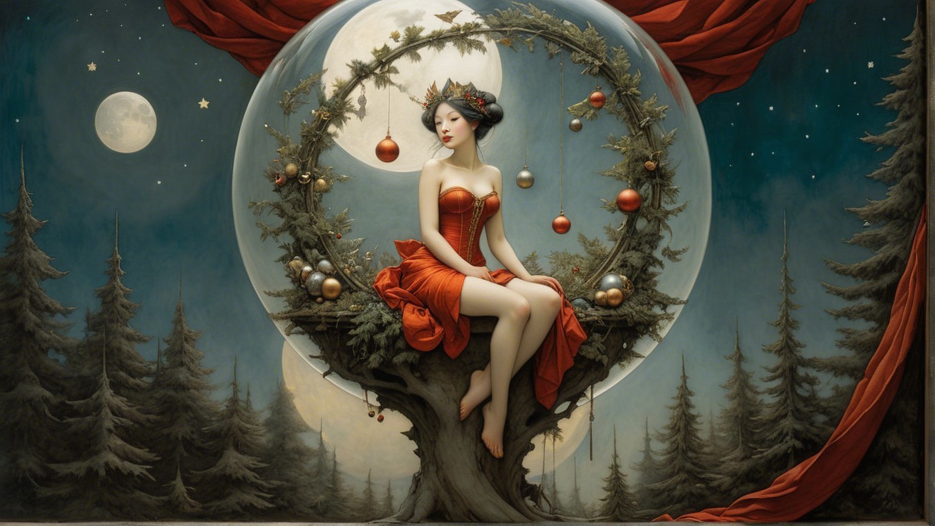 The image features a serene young woman adorned with festive elements, including a white headscarf, holly, and ornaments. The background depicts a wintery scene with evergreen trees and a starry sky.