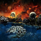 A tranquil landscape at twilight features a serene lake reflecting vibrant colors of a cosmic sky. Silhouetted trees and blooming flowers add beauty to the enchanting scene.