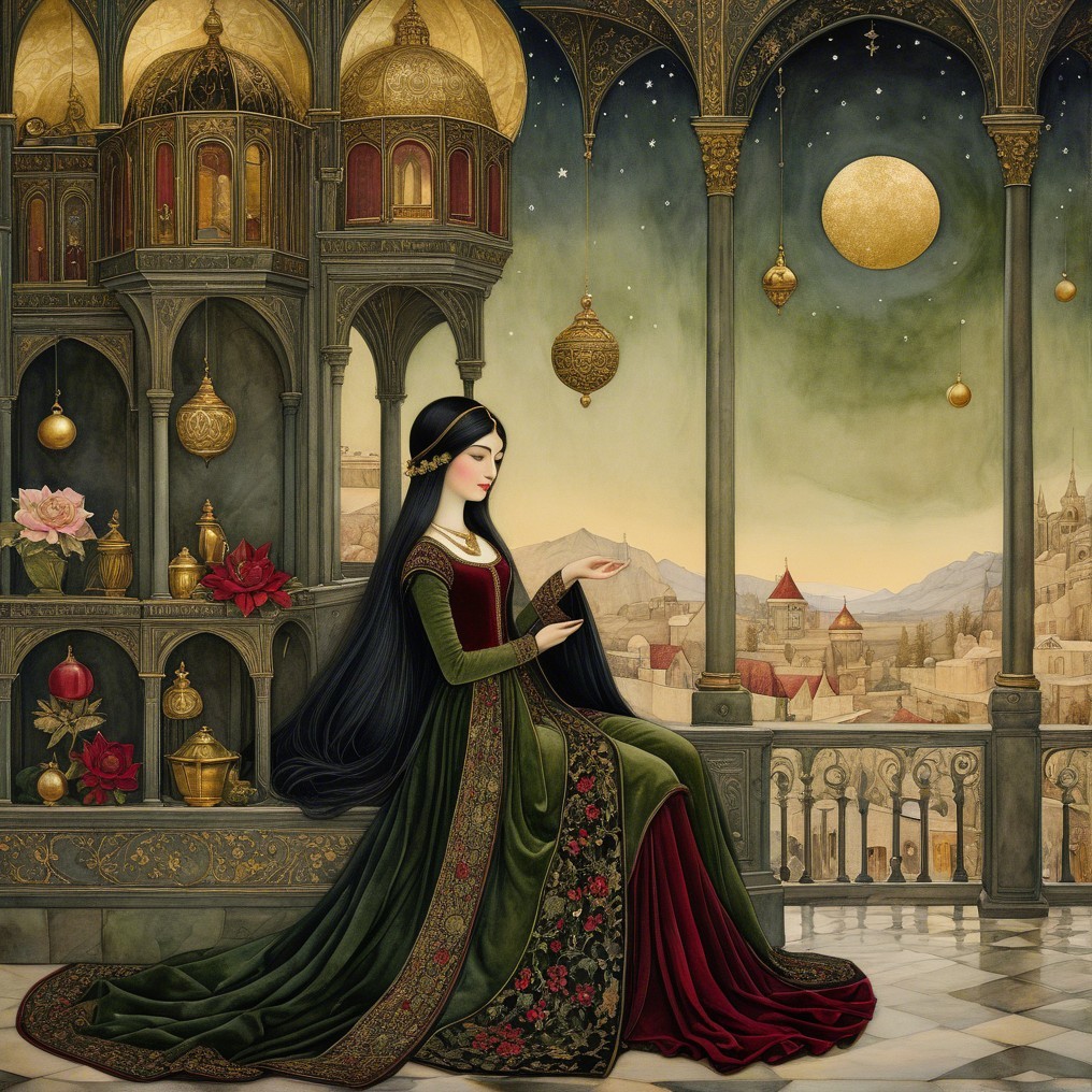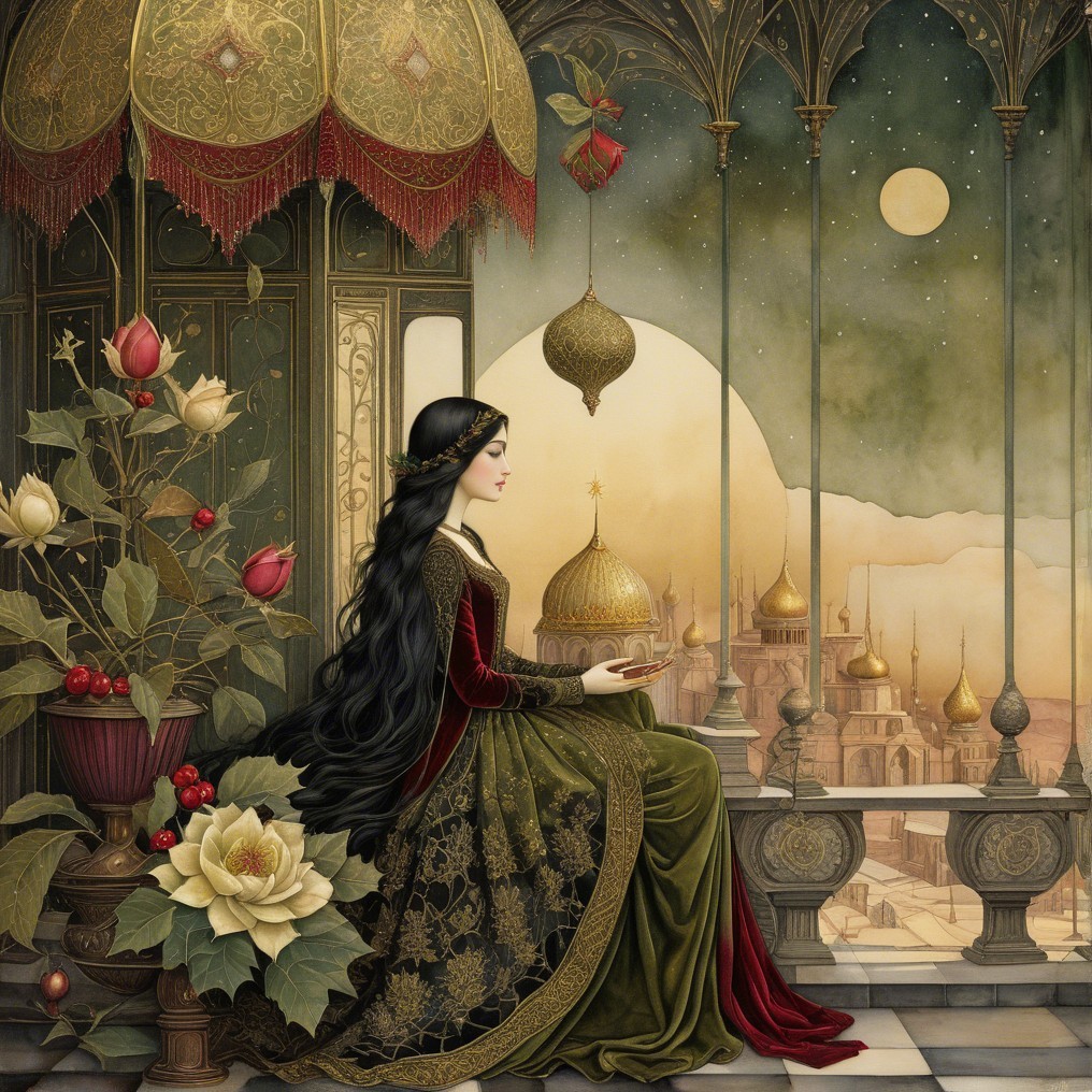Legend of the Christmas girl and the magical Christmas rose palace,, 3rd century Persian miniature art. Velvet Black, Shabby, Dull Gold, olive green, burgundy, Golden Ratio, Surreal Fantasy, Elegant, High Definition Ultra Fine 3D Line, Zenangle Style, Watercolor Patchwork , Arthur Rackham Style, Paul Kidby, Gediminas Prankevicius, Jacek Jerka, Extremely Detailed, Intricate, Thoughtful, HDR, Fractal, Beautiful, Award Winning, Fantasy Look, Fantasy, Crisp Quality