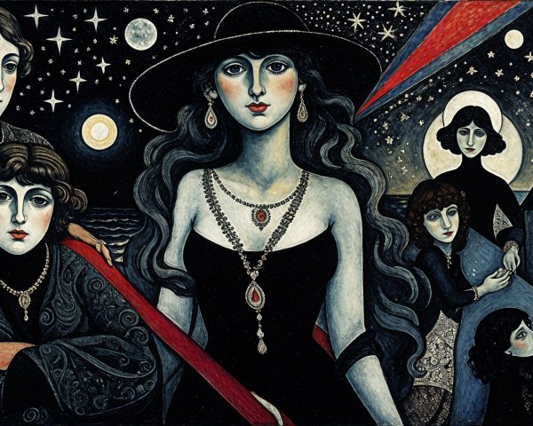 A striking artwork featuring four stylized figures with unique headgear, set against a vibrant backdrop. Their expressions are intense, incorporating abstract shapes and vivid colors.