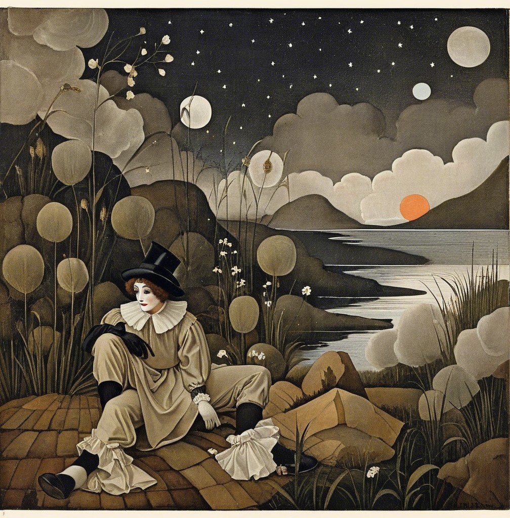 Beautiful Pierrot and Il Dottore who is dressed almost entirely in black—shoes, pants, shirt, robe, belt, and hat—broken only by a white handkerchief, white ruffled collar, white cuffs on his sleeves, or maybe white socks. The pants came to his knees, as did the full cloak that stood out, like a dress with a petticoat. His hat could either be small and look like a skullcap, or larger and floppy with a wide brim Iridescent watercolor and ink By Jamie Heiden, Daniel Merriam, Paul Klee, Karol Bak, Dee Nickerson, extremely detailed, high definition, crisp quality, ultra detailed background art nouveau pierot mysterious dance clown