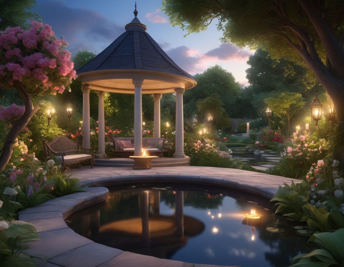 An enchanting garden at dusk featuring a gazebo, blooming flowers, a tranquil pond with floating lanterns, and elegantly set dining table.