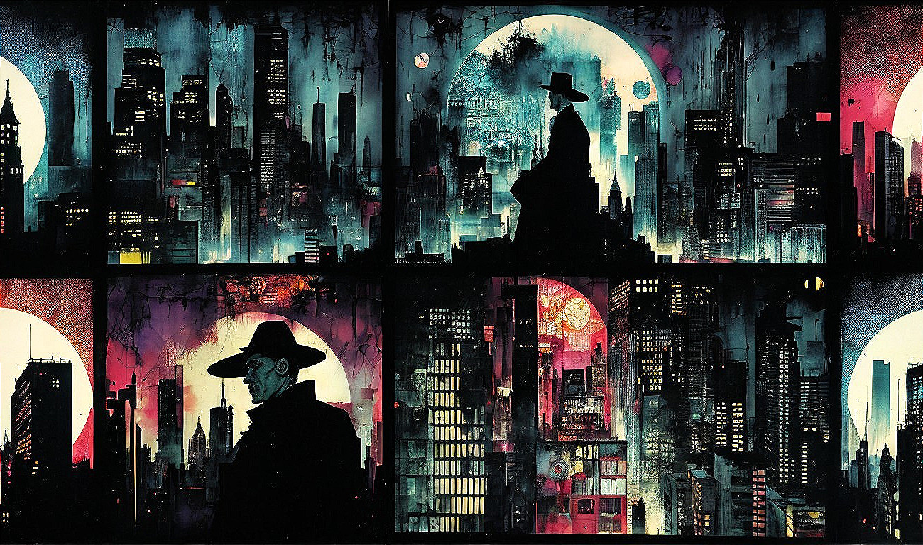 A silhouette of a person with a hat against a stylized, colorful cityscape with moonlit and neon accents, evoking a noir aesthetic.