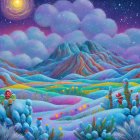 A vibrant landscape featuring rolling hills in shades of blue, green, and yellow. The sky is filled with colorful clouds and a bright sun, creating a peaceful and dreamlike atmosphere.
