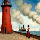 Grateful thanks and credit to original Dreamer/Artist, for the prompt and try-it option. The image depicts a vibrant maritime scene with two elegantly dressed women on a ship's deck. One woman in a striking red dress stands confidently looking ahead, while another in black gazes toward the horizon.