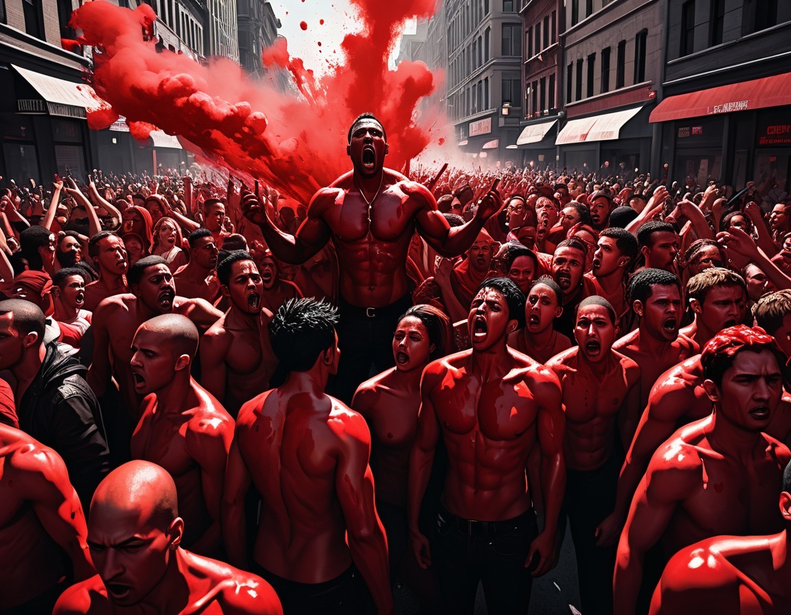 Prompt: "Intense urban protest, crowded city street, diverse group of people, shirtless individuals with red substance resembling blood, central figure in dramatic pose, strong emotional expression, animated crowd, collective fervor, turmoil and raw energy, stark urban environment, visceral display of emotion, dynamic lighting, dramatic shadows, gritty and intense atmosphere, high contrast, digital art, detailed realism, vibrant color palette, raw emotion captured, by Banksy and JR, Artstation."