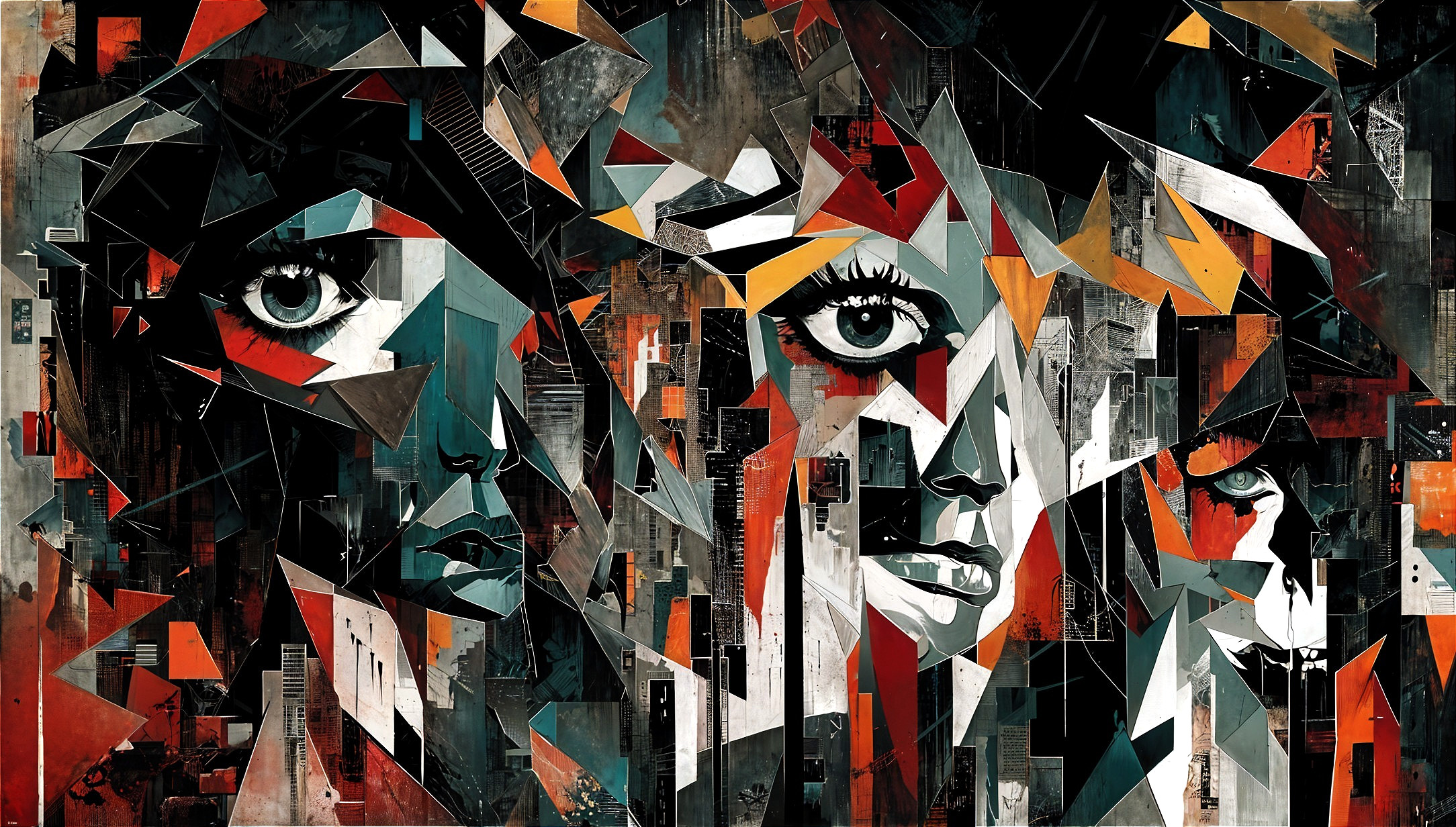 An abstract, cubist-style painting in which three faces of women are visible on a dark background. The two faces on either side of the painting face the viewer, while the one in the middle is seen in an almost profile angle with a slight tilt towards the right. The face on the left