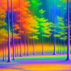A vibrant landscape with tall trees and colorful, swirling clouds in the background. The scene features a spectrum of bright colors, creating a surreal and dreamlike atmosphere.