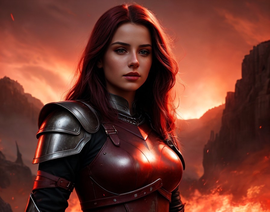 Fierce Warrior in Gleaming Armor Against Fiery Backdrop
