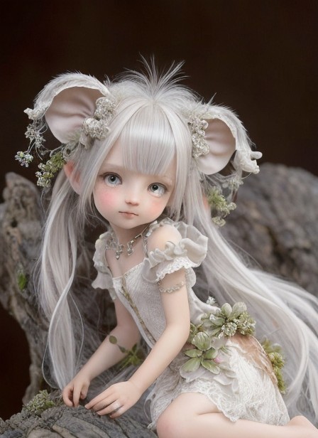 An image of a fantasy creature with white hair, animal ears, a tail, large eyes, and floral adornments.