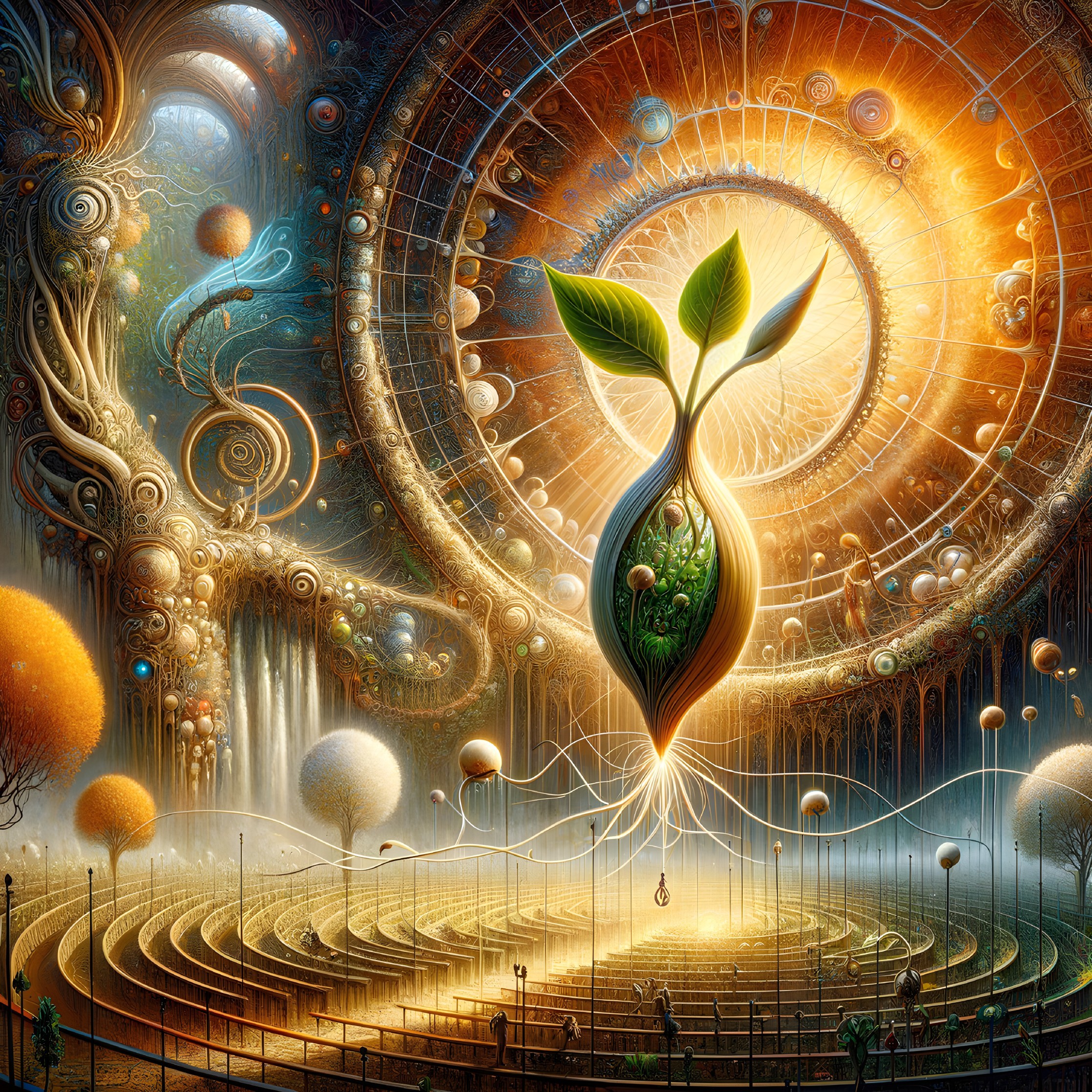 A vibrant, surrealist artwork featuring a sprouting plant within a sphere, surrounded by intricate cosmic and mechanical designs, evoking a blend of natural and fantastical elements.