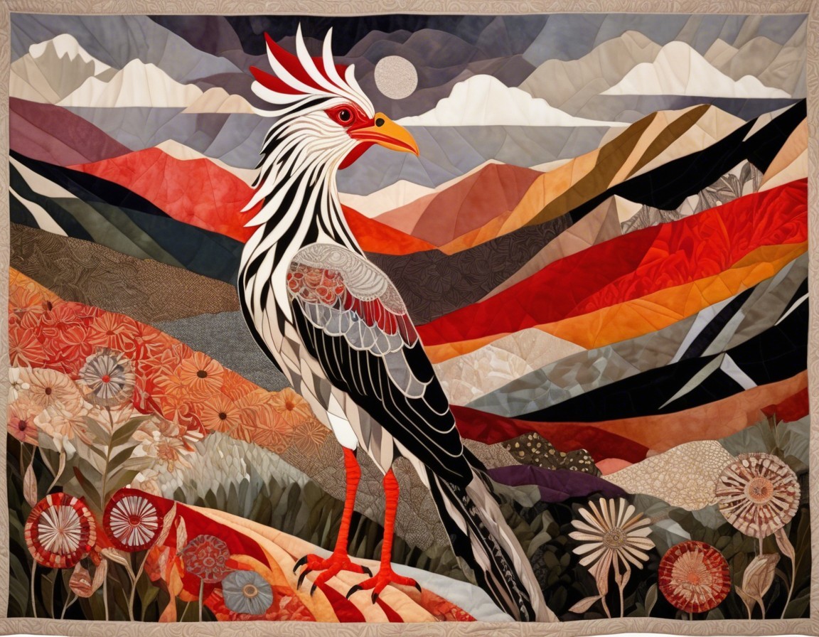 Enhance with more detailed background patterns and textural embroidery on the bird: Quilt with visible stitching and patched prints depicting a 2ild secretary bird in front of the mountains, with intricate zentangle patterns in shades of red inspired by Gustav Klimt, delicate swirls and geometric shapes, ethereal and dreamlike atmosphere, high detail digital illustration, ornate and decorative elements, soft and warm lighting, Art Nouveau influence.