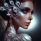 A close-up of a striking woman adorned with vibrant feather-inspired makeup and a colorful headdress, showcasing detailed facial art and captivating blue eyes. The background is softly blurred.