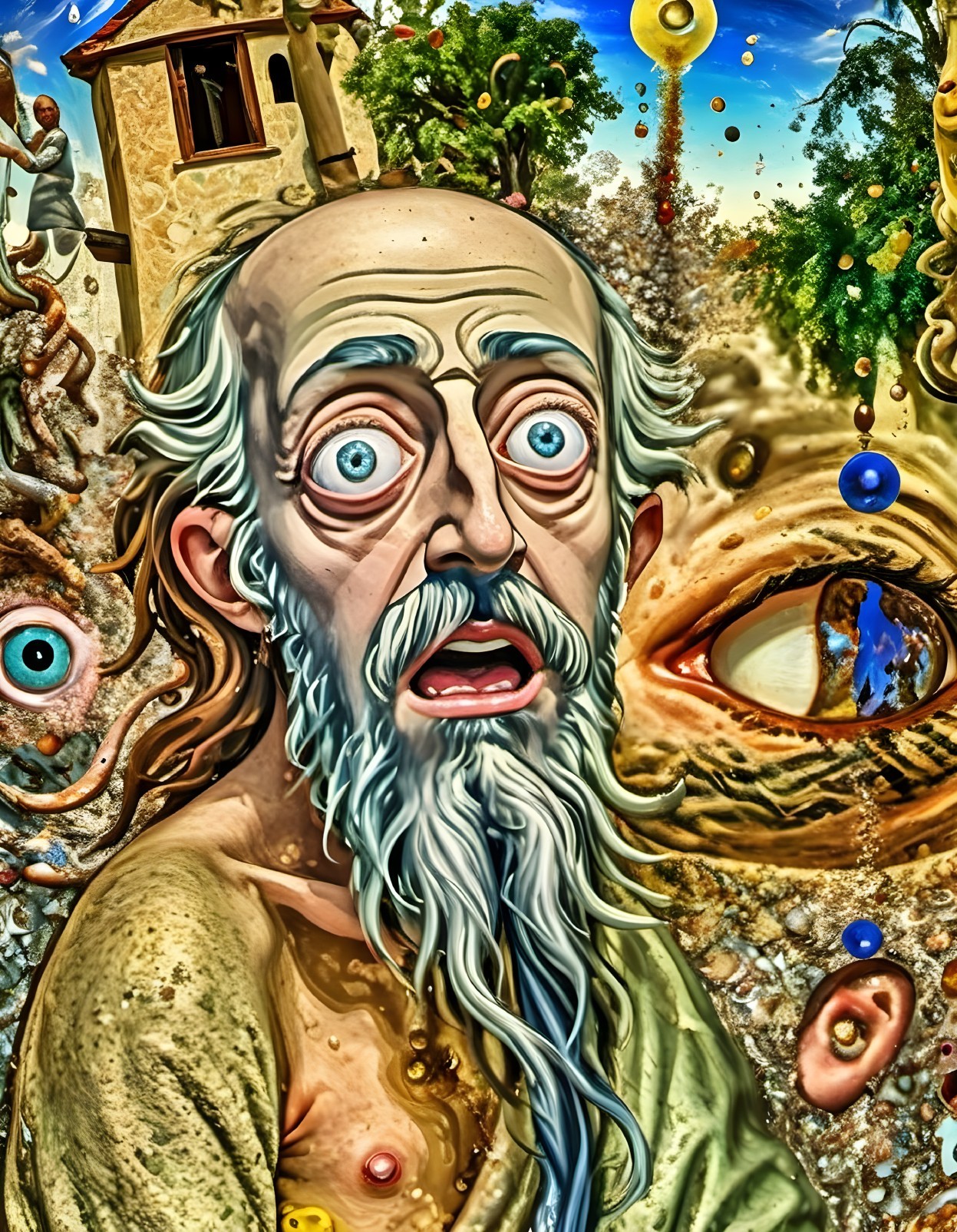 Surreal artwork with a wide-eyed man's face and various disjointed elements, like eyes, in a chaotic townscape.