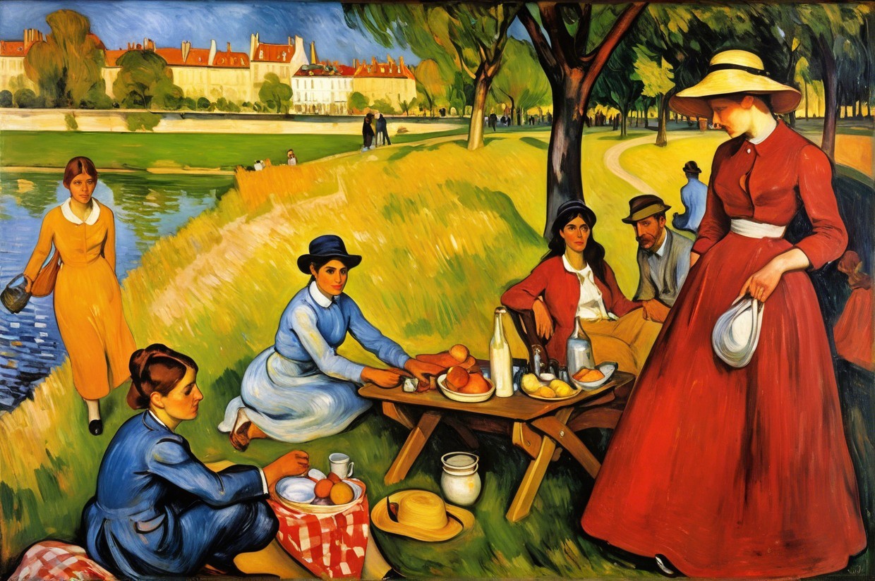 A picnic scene in the park by the river Seine, Paris. A group of people are enjoying food and drinks. Lush greenery surrounds them, with a bridge in the background and a relaxed, sunny atmosphere.