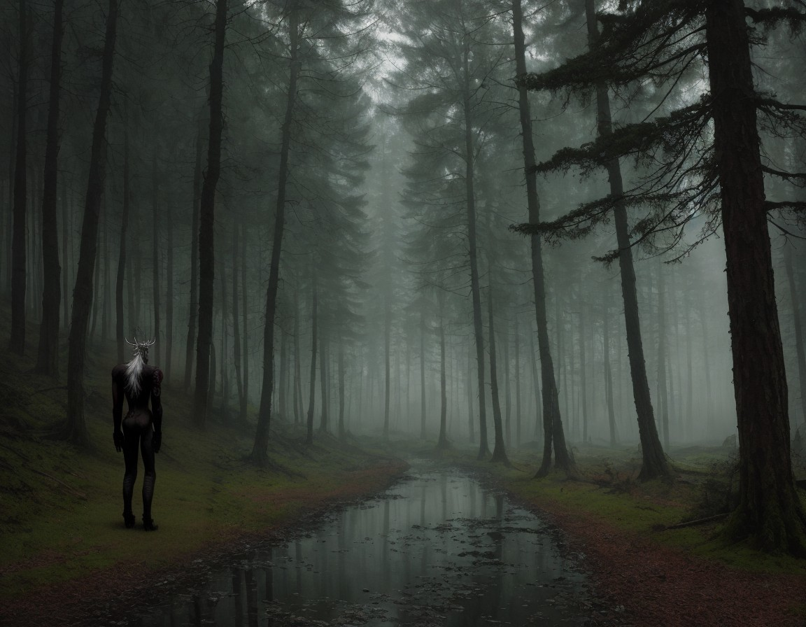 Person in Deer Skull Mask Stands in Misty Forest
