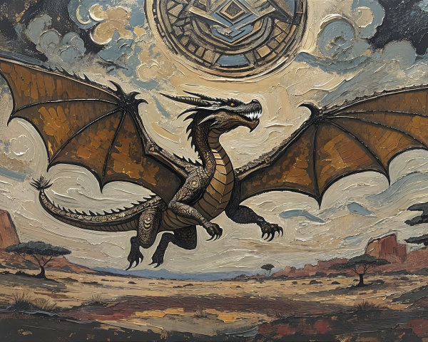 A vibrant, surreal painting merging various historical and fantasy elements, featuring dynamic human figures, a steam train, and a colorful sky.