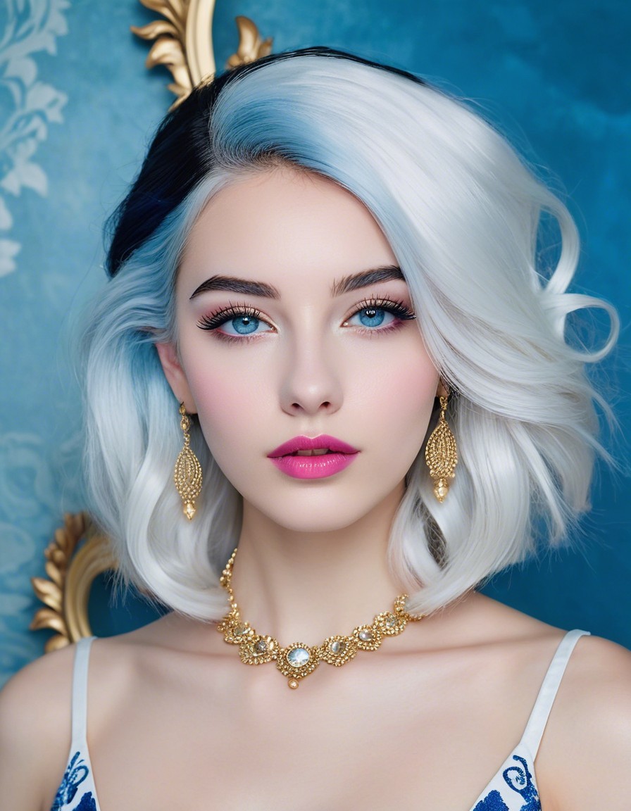 Beautiful and ethereal young woman, dreamy portrait, porcelain skin, almond-shaped bright pink eyes, black eyeliner, lush eyelashes, intense siren-like gaze, straight nose, deep duck blue lips, Long sleek blue and white hair, blue hair roots, white eyebrows, platinum and deep dark blue abstract background, gold and silver tones, ornate regal silver pin in hair, vintage color palette, cool tones, warm details, vintage artistic mood, Asian woman, light blue blush, purple eyeshadow, full lips, side profile, traditional hairstyle, vibrant glowing aura, intricate silver and sapphire earrings, embroidered dress, ethereal background, cold winter vibes, soft color palette, elegant lighting, intricate details, high-resolution digital art. Full body portrait of the woman in a gothic throne room. The atmosphere is a complex mixture of radiance and undersea light.