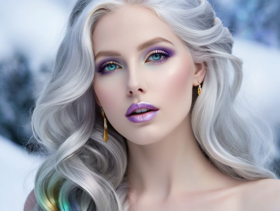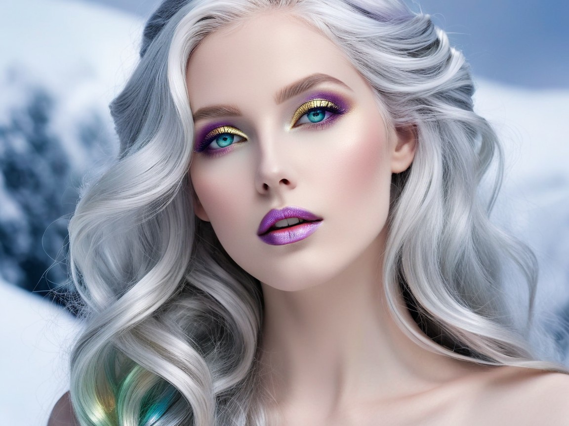 A stunning model with long, flowing silver hair and vibrant makeup features striking purple and gold eyeshadow, complemented by shimmering lips. She wears elegant earrings against a snowy backdrop.