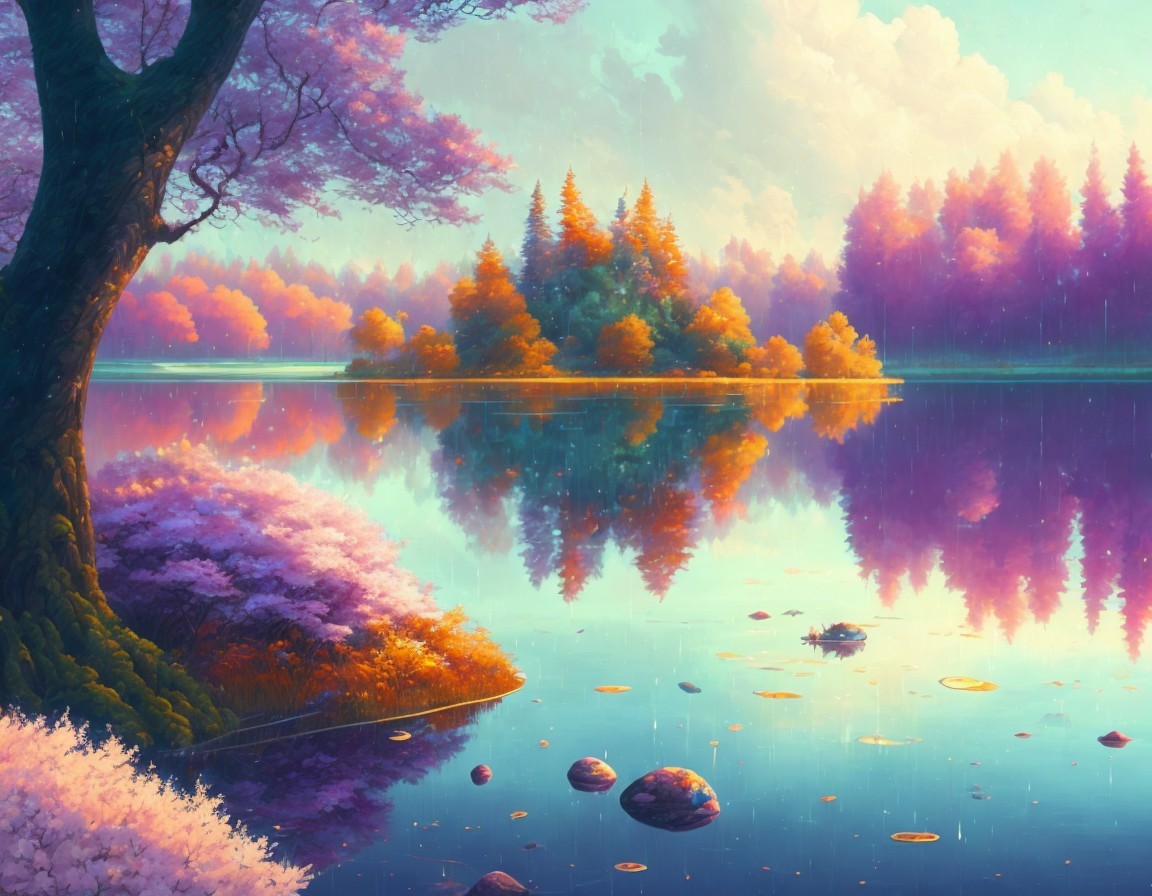 A serene landscape of spring rain over a lake with a traditional building on an island in the center, surrounded by blooming trees reflecting in the water under a glowing, dusky sky.