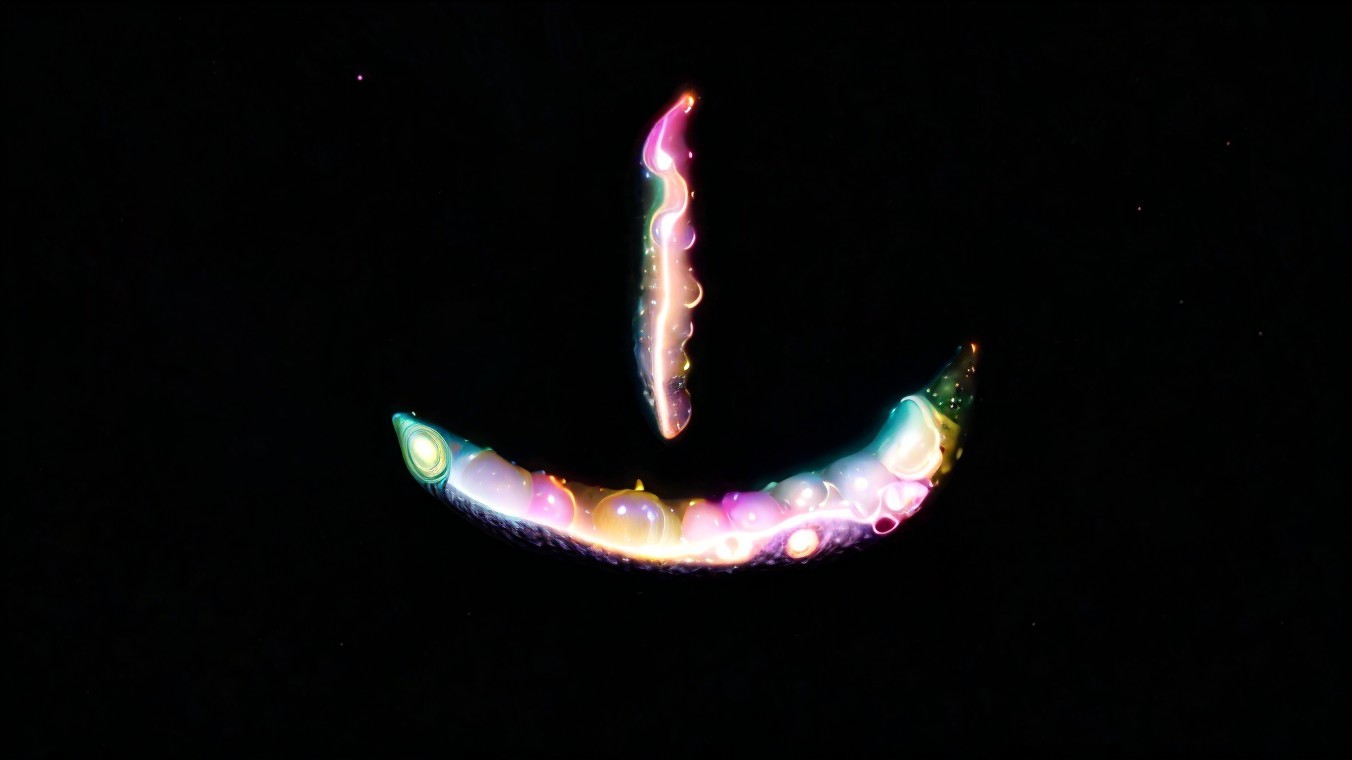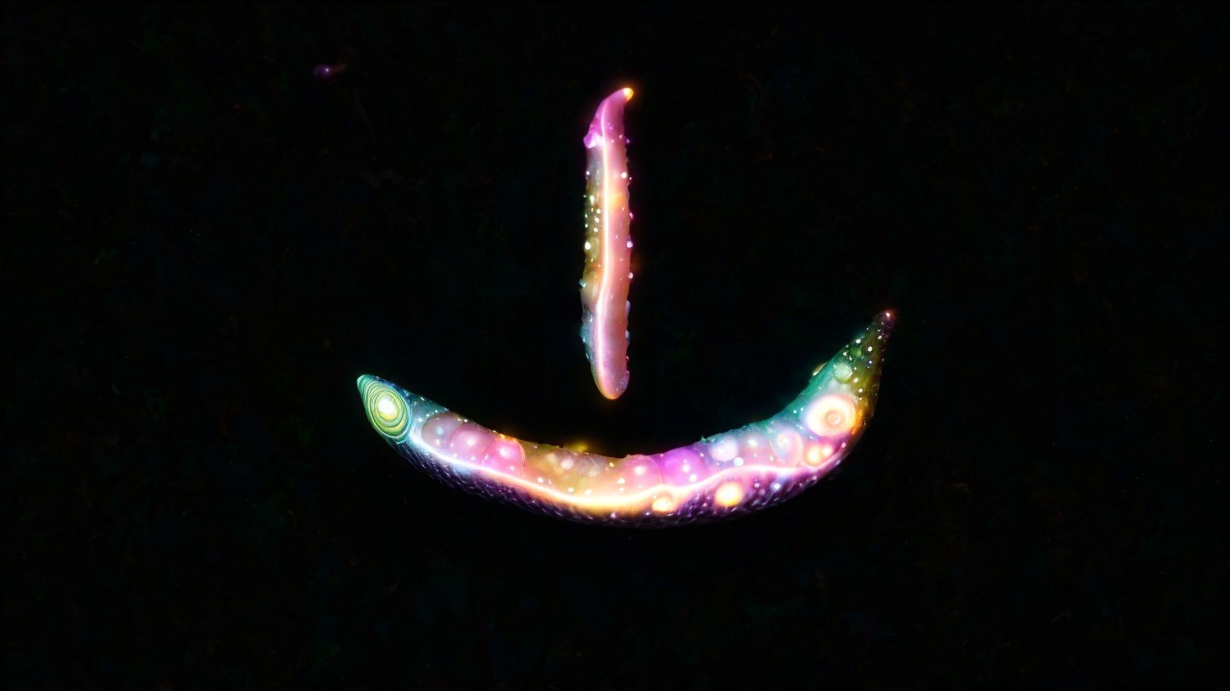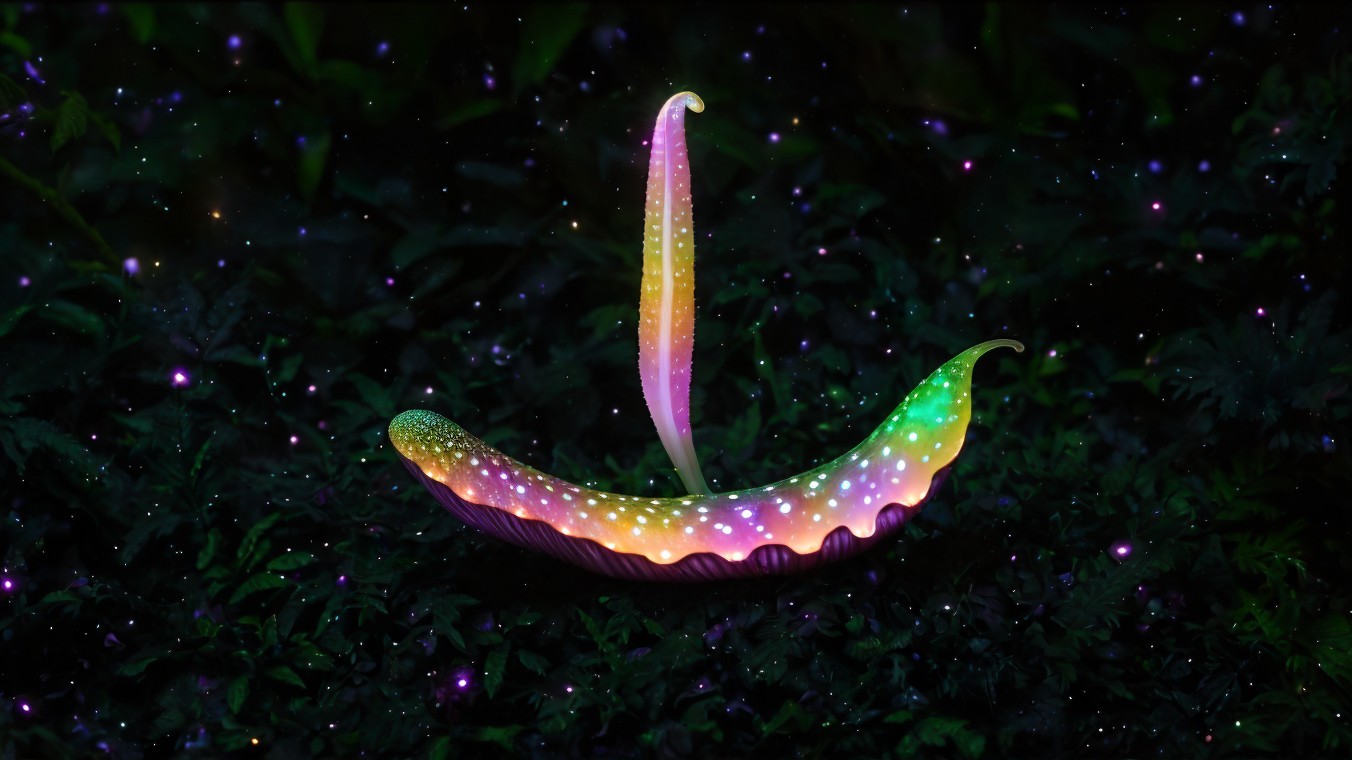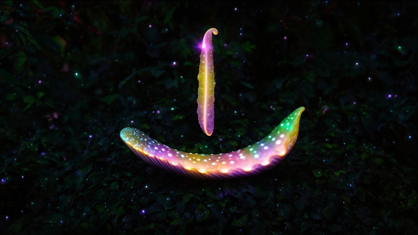 A vibrant, glowing neon slug amidst a dark foliage background with sparkling dots resembling stars around it.