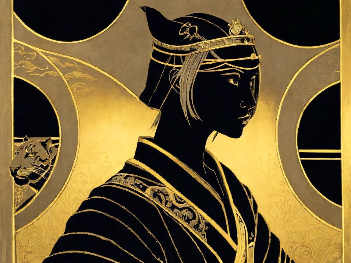 Legend of the Girl and the panther , Medieval Japanese Artists Sumi-e Style, Velvet Black, Shabby, Dull Gold, Amber Gray, . dramatic