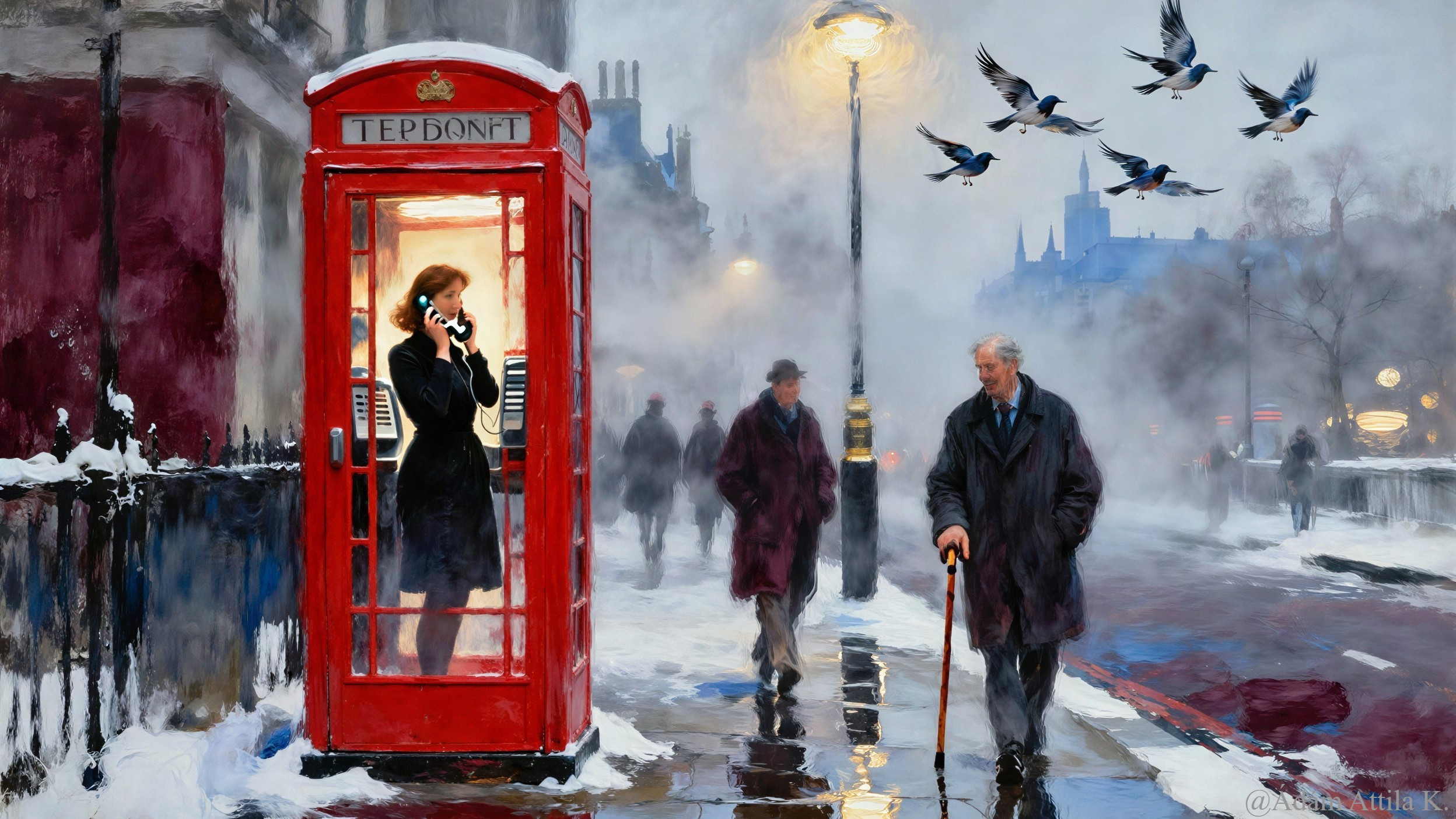 A winter scene on a London street. A woman with auburn hair stands in a red telephone booth, making a phone call. The top of the phone booth is covered in snow, and there is snow on the ground around the bottom. People are walking on the snowy street.