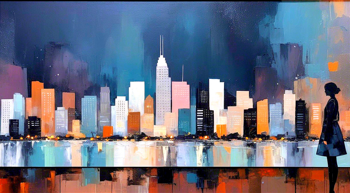 A vibrant city skyline at twilight, featuring tall buildings with bright lights, reflecting on the water. A silhouette of a person stands in the foreground, gazing at the mesmerizing view.