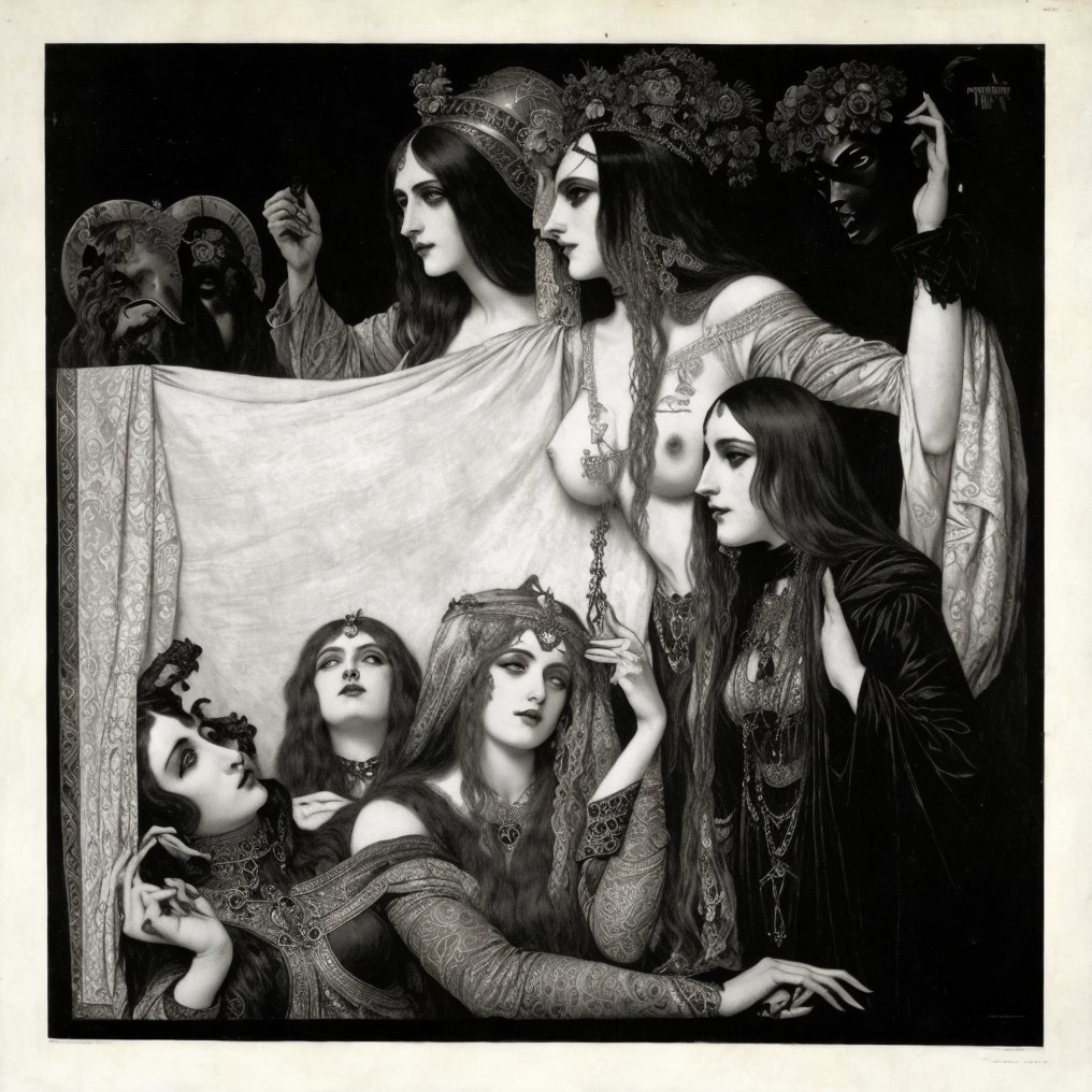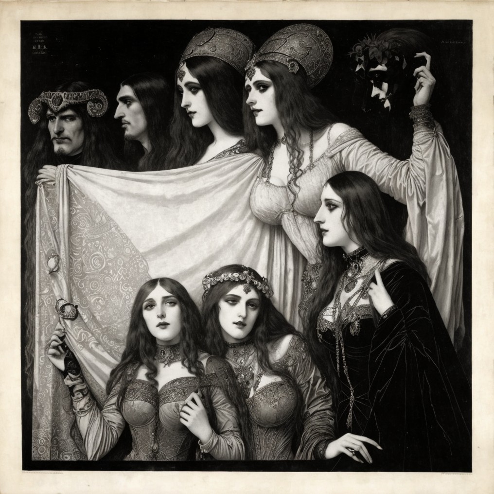 Seven women in intricate costumes and headdresses holding a banner in vintage monochrome.