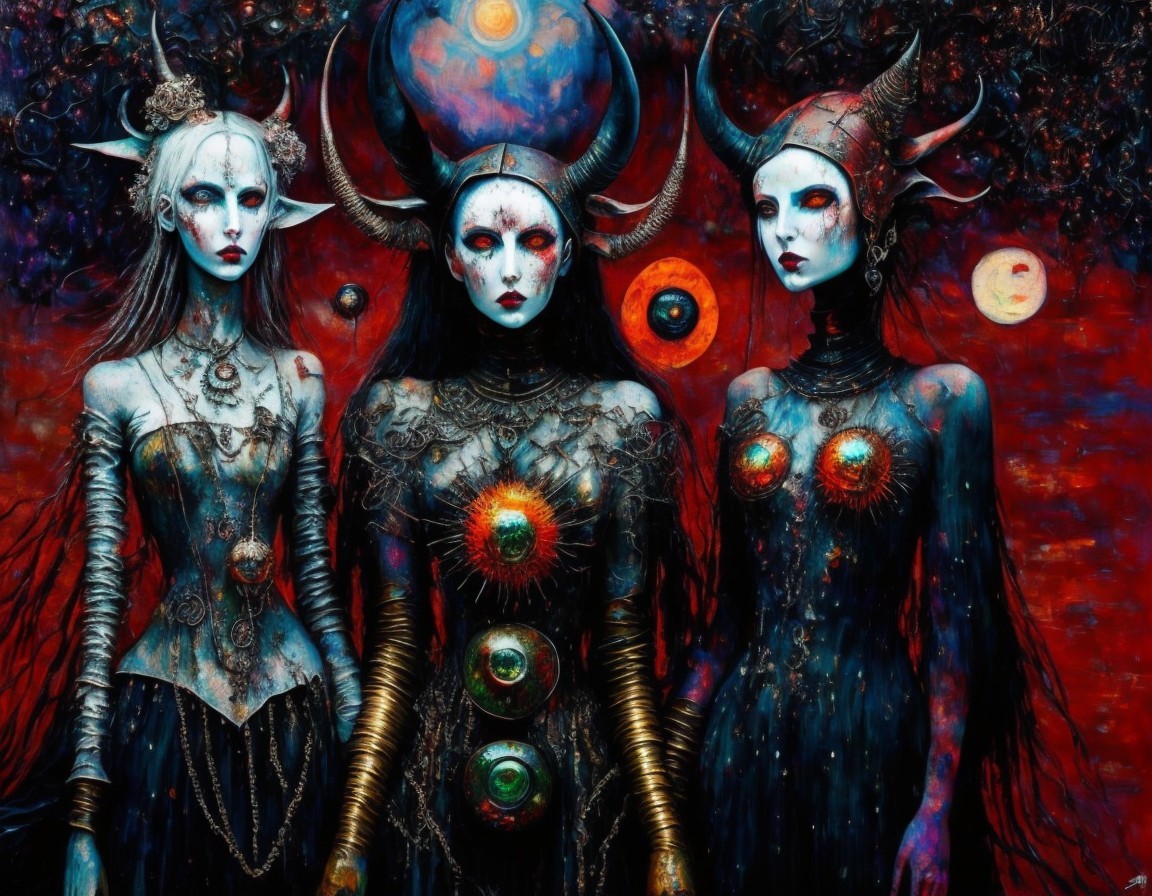 Three women with horned headpieces and gothic attire stand before a cosmic backdrop with planets and an eye.