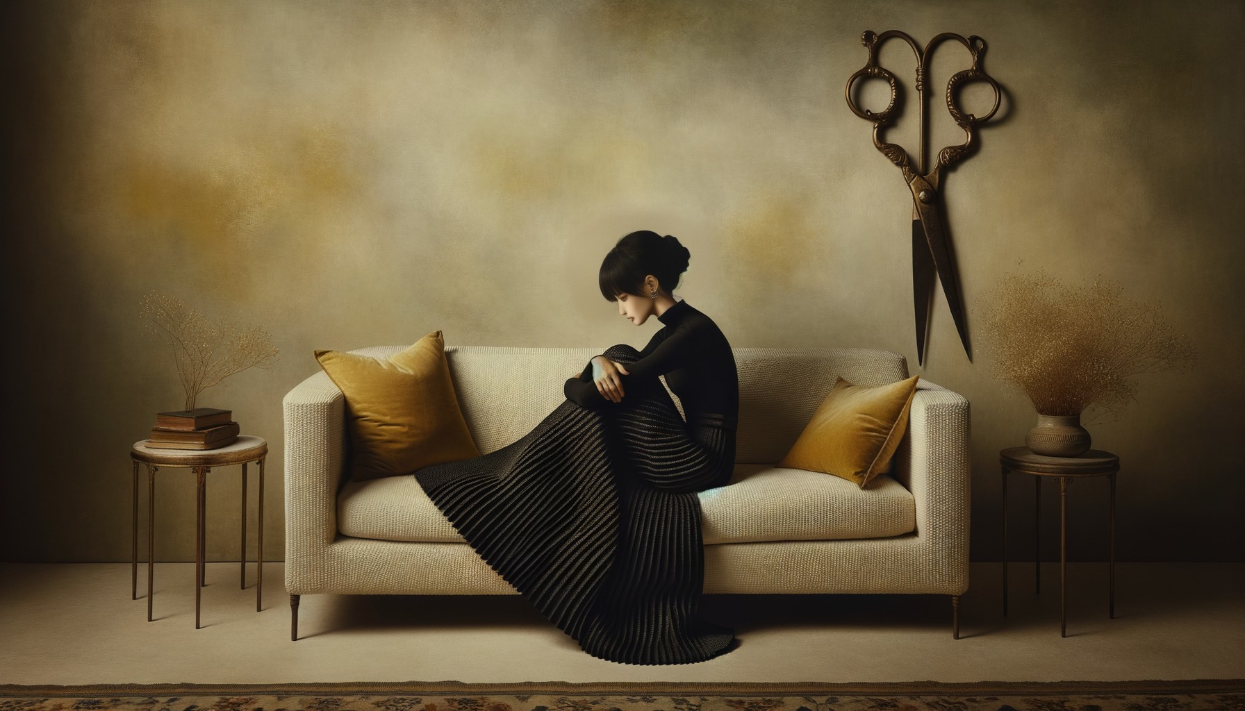 A contemplative woman sits on a beige couch with golden pillows, next to oversized scissors against a moody, textured backdrop.