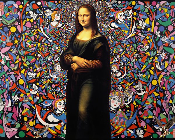 _||- standing confidently in a lush garden, holding a toddler and with a young child by her side. The scene radiates a retro vibe with a vibrant, colorful background.