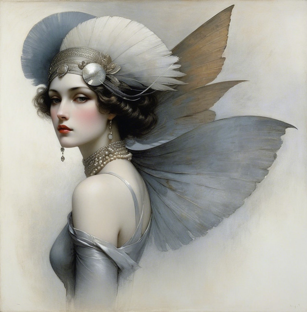A graceful woman in a soft blue gown, adorned with a musical-themed fan and pearl accessories. The background features subtle music notes, enhancing the elegant, artistic ambiance.