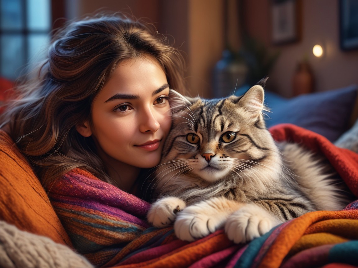 A young woman relaxes under a colorful blanket, cuddling with a fluffy cat. The setting is cozy, with warm lighting and a homely atmosphere. Both appear content and comfortable.