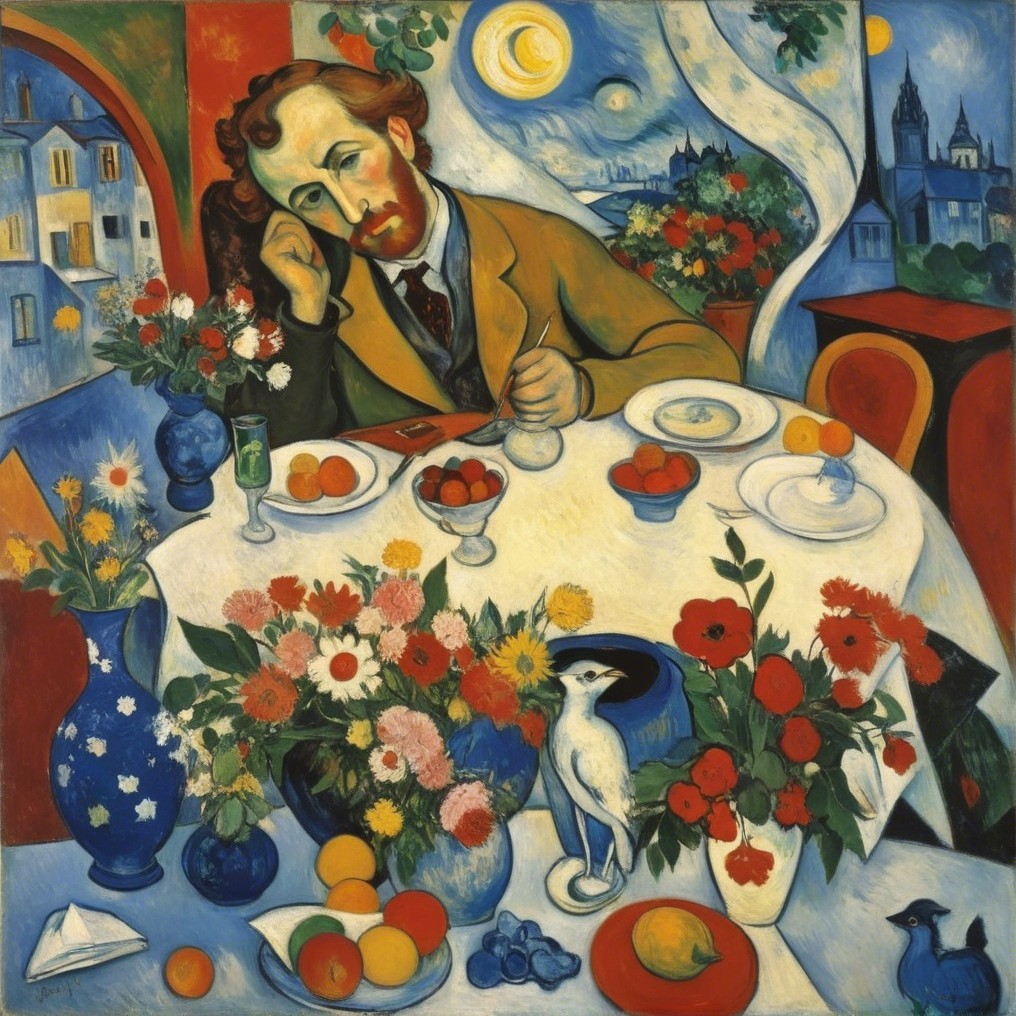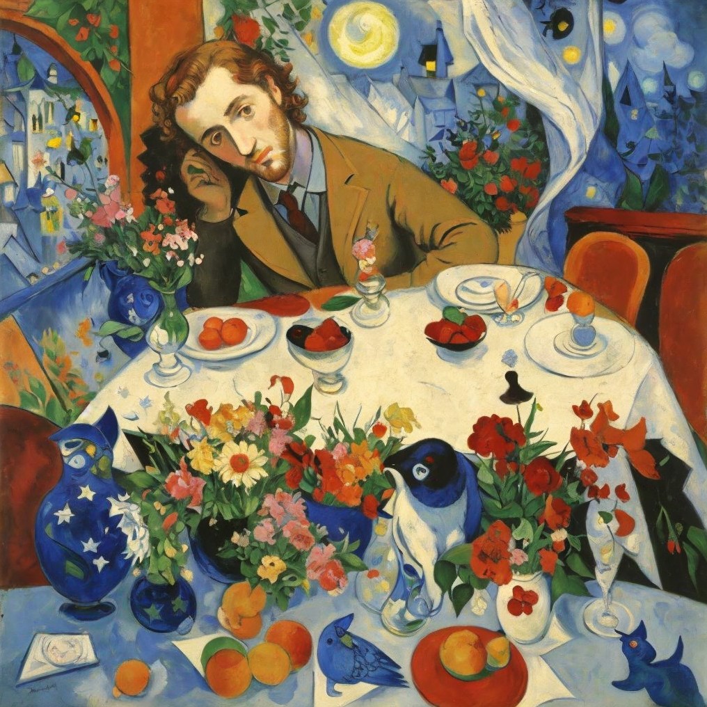 Artistic Statement: "Melancholy at the Feast" combines Naïve Art, Post-Impressionism, and Expressionism, drawing heavily from the vibrant palettes and flattened perspectives of Chagall, Pirosmani, and Matisse. It explores the dissonance between inner emotions and external beauty, celebrating life’s contradictions in a stylized, dreamlike scene.