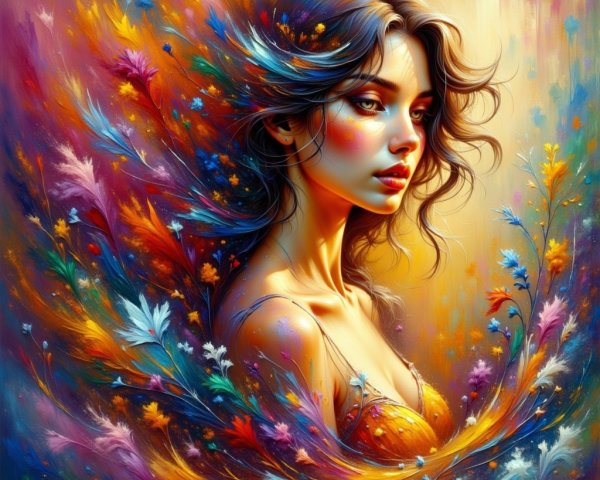 A serene woman in a flowing red gown stands by a tranquil lake at sunset, with majestic mountains in the background and blooming roses nearby, creating a captivating and romantic atmosphere.