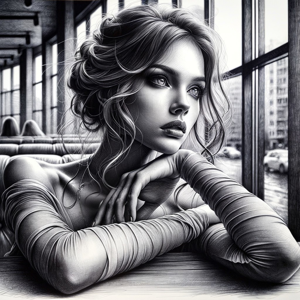 A thoughtful woman with elegant features and long hair gazes out of a café window, lost in contemplation, surrounded by a modern urban backdrop. Soft light highlights her serene expression.