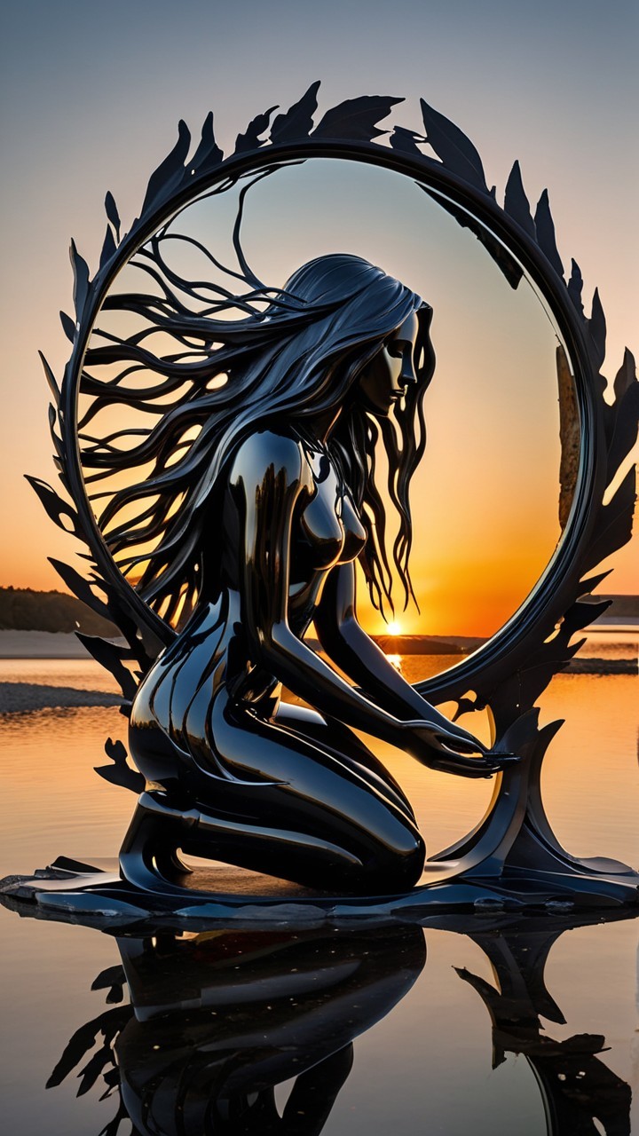 A sleek black sculpture of a woman kneeling, framed by a circular design. The scene is enhanced by a vibrant sunset reflecting on water, creating a serene and artistic atmosphere.